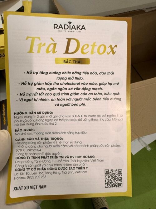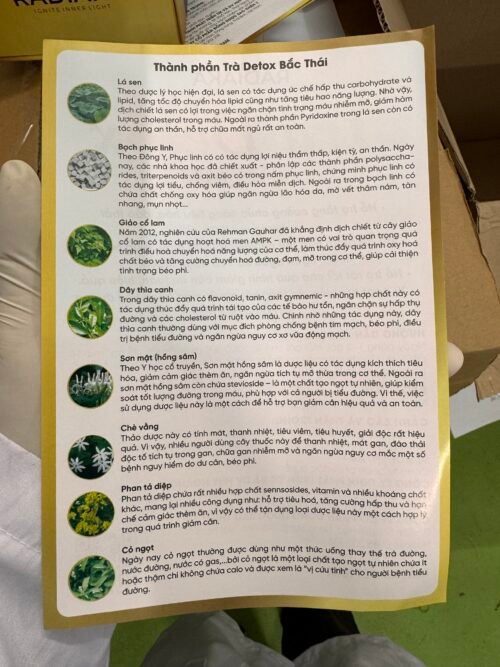 Lá sen, Bạch phục linh, Giảo cổ lam, Dây thìa canh, Sơn mật (hồng sâm), Chè vằng, Phan tả diệp, Cỏ ngọt: vừa đủ túi 2,5g.